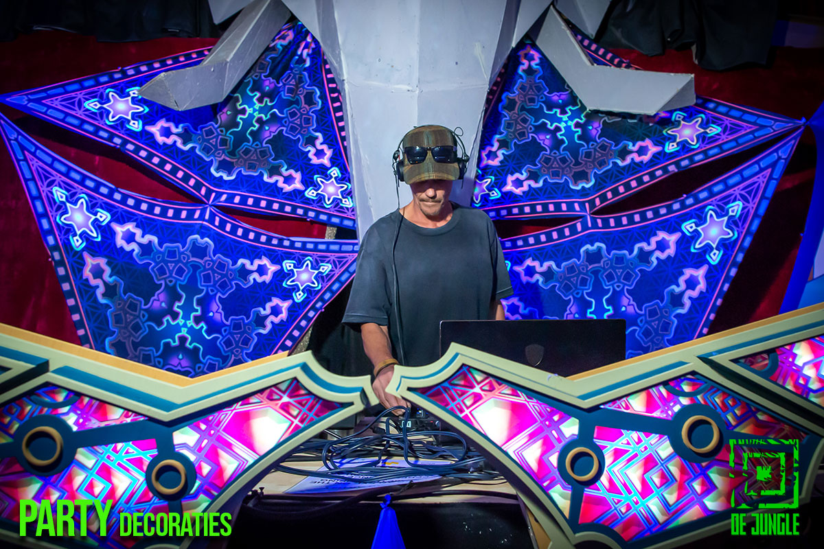 - DJ in kleurrijke decoratie DJ Booth in de Jungle