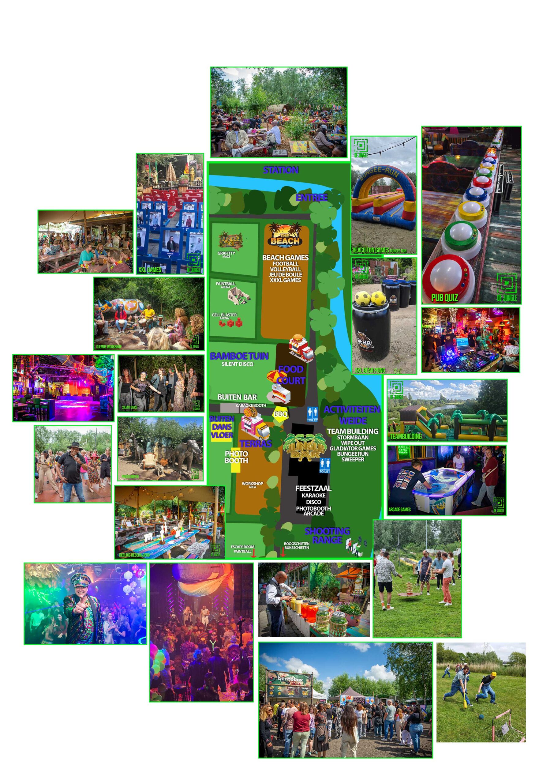 Onze locatie biedt uitgebreide mogelijkheden om van uw evenement een onvergetelijk succes te maken. De Jungle is een unieke plek met zowel binnen- als buitenfaciliteiten voor bedrijfsfeesten, teamuitjes, summer parties, dansfeesten en foodtruckfestivals. Op ons 8,5 hectare grote park kunnen wij diverse sportieve en feestelijke arrangementen faciliteren. Met onze huidige initiatieven zijn we al uniek, maar onze multi-inzetbare ruimtes bieden plek voor meer... veel meer!